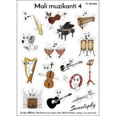 Na jednom aršíku velikosti A5 najdete 15 vinylových samolepek různých hudebních nástrojů. Malí muzikanti 2: činely, akordeon, housle, cimbál, akustická kytara, trubka, kontrabas, rolničky, elektrická kytara, hoboj, lesní roh, cajon, klavír-křídlo, harmonika, malý buben