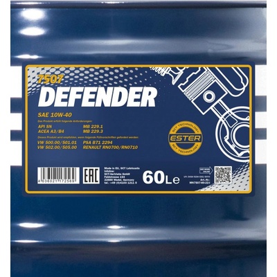 Mannol Defender 10W-40 7507 je polosyntetický motorový olej s estery, který poskytuje vynikající ochranu motoru, stabilní výkon a čistotu motoru. Ideální pro moderní i starší benzinové a dieselové motory, včetně motorů s turbodmychadlem. Mannol Defender 10W-40 7507 je...