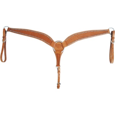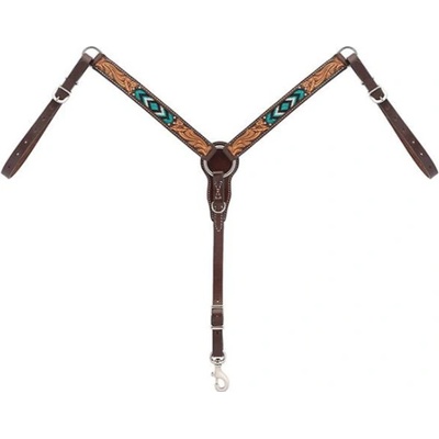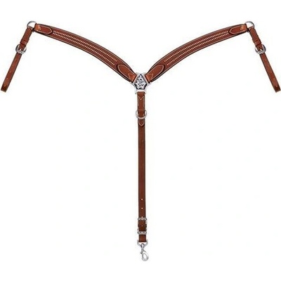 Kvalitní kožený westernový poprsník pro koně se zdobením. Vyrobený z olejované kůže s ozdobným vzorem a korálky. Kovaní vyrobené z nerez oceli.