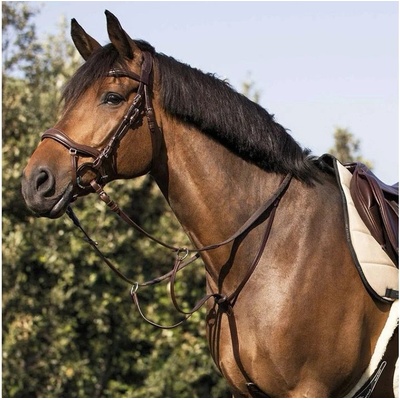 Elegantní poprsník vyrobený z vysoce kvalitní kůže. S přezkami z nerezové oceli, elastickou vložkou na krku a odnímatelnými martingalovými vidlicemi. K dispozici v hnědém i...