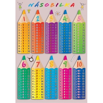 Laminátová kartička určená především pro žáky základních a středních škol nabízí graficky přehledný a stručný přehled malé i velké násobilky Násobky jednotlivých čísel jsou na barevně odlišených pestrých obrázcích které působí hravě a napomáhají lepšímu zapamatování