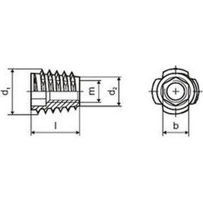 Metrická matice závrtná ze slitiny zinku d1 - vnější průměr závitu d2 - vrtaný průměr ve dřevě b - rozměr imbusového klíče pro montáž h - průměr nákružku l - délka...