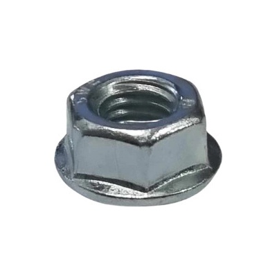 Šestihranná ocelová pozinkovaná matice s ozubeným límcem. Ozubený límec na spodní straně se zaryje do materiálu a tím zabraňuje uvolnění matky.