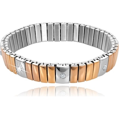 Ocelový pružný náramek z úzkých článků zlaté a měděné barvy, širší dílky ve stříbrném odstínu se zirkony.