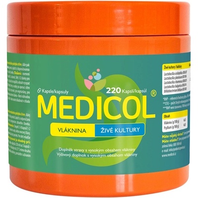 Medicol je multi-vlákninový přípravek obsahující jemné psyllium, které přispívá k udržování normálního pohybu střev, dále pak inulín, tedy prebiotikum a 5 kmenů probiotických kultur. Plus benefit - směs rostlinných trávicích enzymů.