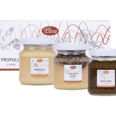 Dárková krabička s medy propolis, kakaové boby a rakytník v medu 3x170 g - Pleva Hledáte-li vhodný dárek pro někoho, kdo ocení poctivý český produkt, rád si pochutná, ale...