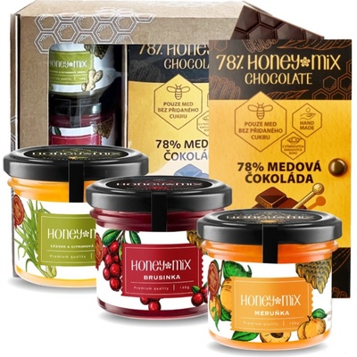 HoneyMix dárková sada obsahuje 3 medy s ovocem a medovou čokoládu bez přidaného cukru, v elegantním balení – ideální jako zdravý a chutný dárek.