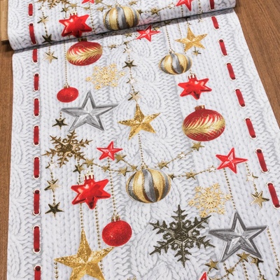 Bavlněná látka (tkanina) štola na metráž se vzorem vánoční dekorace a hvězd na šedém vzoru pleteniny. Látka je v šířce 50 cm, vyrobena ze 100% bavlny (gramáž 230g/m2) v plátnové...