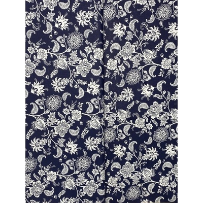 Tato nádherná bavlněná látka má tmavě modrý podklad, na kterém vyniká bohatý bílý vzor složený z květinových ornamentů a paisley motivů. Design působí elegantně a nadčasově,...