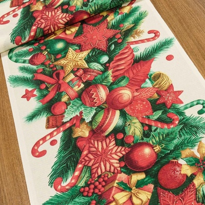 Bavlněná látka (tkanina) štola nebo také utěrkovina na metráž se vzorem vánoční červené dekorace na smetanovém podkladu. Látka je v šířce 50 cm, vyrobena ze 100% bavlny (gramáž...