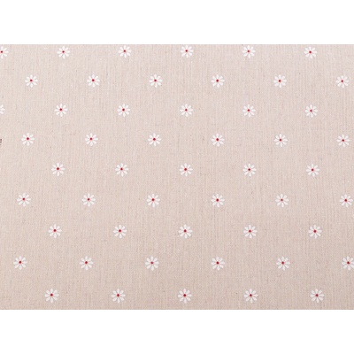 Bavlněnou látku zdobí potisk drobných květů. Svou plátnovou vazbou připomíná len. Je hrubší, pevná, vhodná na šití ubrusů, běhounů, prostírání, dekoračních polštářů, dětských...