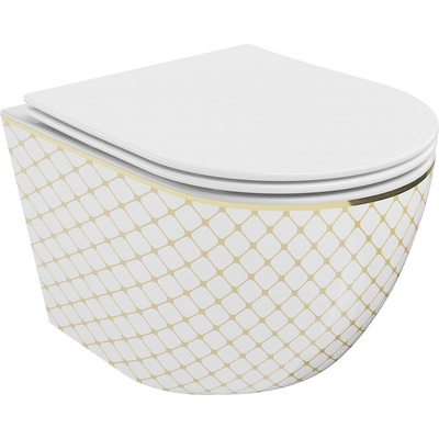 Technické údaje: Rozměr: 48x36x35,5 cm Montáž: Závěsná Rozteč upevnění: 18 cm Materiál: Sanitární keramika Barva: Bílá/Zlatá vzor mřížka Typ odpadu: Horizontální Systém splachování: Rimless (bezokrajový) Druh prkénka: Pomalu sklopné Barva: Bílá Materiál:...