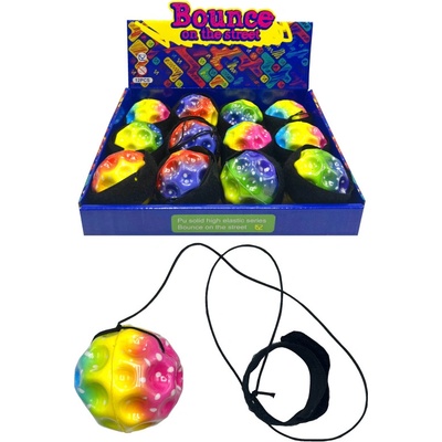 Skákací barevný tréninkový míček o velikosti 6cm, na gumě. Vracející se balonek na baterie, se světlem. 4 barevné varianty. Barevný míček se světelným efektem! Po hození míčku...