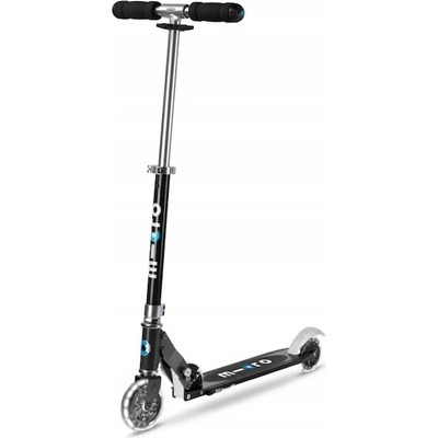 Dětská skládací koloběžka Sprite v nepřehlédnutelné černé neochromové barvě s širokými V řídítky a LED kolečky o průměru 120 mm. kompaktní lehká koloběžka určená pro děti ve...