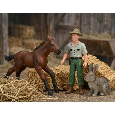 Sada obsahuje figurky zvířátek, figurku farmáře a doplňky. Materiál: plast Druhy: se selátkem, s králíkem, s grošovaným hříbětem, s hnědo-bílým hříbětem Baleno v krabičce.