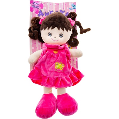 Usměvavá, měkká a lehká panenka holčička Anežka v šatičkách, s tmavými vlásky, z plyše, která umí zpívat písničky a mluvit česky. Hračka na baterie se zvukem, česky mluvící....