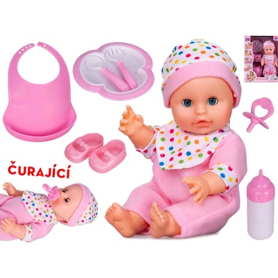 Roztomilé mrkací a čůrající miminko má tvrdé tělíčko. Oblečení a doplňky jsou laděny do růžové barvy. Miminko jistě zaujme nejednu holčičku. Rozměr: 30 cm Materiál: plast,...