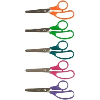 Nůžky s pohodlným ergonomickým úchopem. Bezpečný kulatý hrot. Plastová rukojeť v barevném mixu oranžové, růžové, modré, fialové a zelené barvy. Kvalitní ostří z nerezové oceli. Rozměr 14,7 x 5,3 x 1,1 cm.