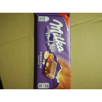 Alpská mléčná čokoláda s arašídy (13 %), kousky s karamelovou příchutí (3 %) a obilnými křupinkami (1,5 %). Křupavé potěšení z Alp. S lahodnými oříškovými křupinkami Milka...