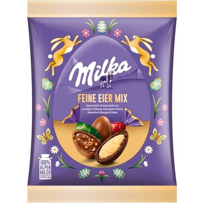 Milka Feine Mix čokoládová vajíčka 138 g Směs alpského mléka , čokolády, plněného alpského mléka,čokolády a bílé čokolády Nutriční hodnoty na 100g: Energetická...