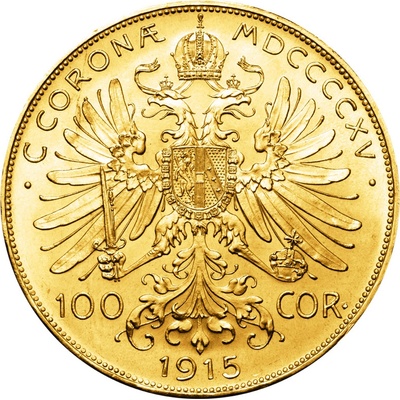 Rakouská stokoruna 1915 - Novoražba Dlouho předtím, než někdo vůbec pomyslel na Krugerrandy, Rakousko-Uhersko už vyrábělo velké zlaté mince - Stokoruny. Ty byly vydávány v letech 1908 až 1914. V typické rakouské tradici se po smrti Františka Josefa v roce 1916 začaly...