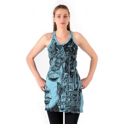 Krátké šaty Sure s širšími ramínky ve stylu tank top. Barva tyrkysově modrá, atraktivní potisk s motivem Buddhy a motýlů. Elegantní sportovní střih se snadno přizpůsobí postavě....