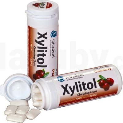 žvýkačky s xylitolem - brusinka Miradent žvýkačky jsou unikátní tím, že obsahují látku xylitol. Tento přírodní cukr nezvyšuje hladinu cukru v krvi, navíc žvýkačky neobsahují jiné přidané cukry a umělá sladidla, takže tyto žvýkačky si mohou dopřát i diabetici. Xylitol...