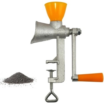 Kovový ruční mlýnek na zpracování máku má odolnou konstrukci, která vydrží. Ke stabilnímu upevnění slouží šroub.