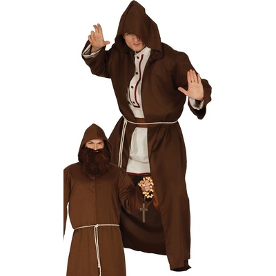 Kostým mnicha s kapucí a páskem. Barva: hnědá Materiál: 100% polyester Velikost: M/L Pokud položka není výslovně uvedena v seznamu doplňků, pak není součástí...