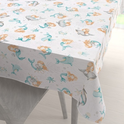 Dětský bavlněný čtvercový dekorační ubrus na stůl s milým dětským motivem modrozelených mořských panen s delfíny a velrybami na bílém podkladu. Je ušitý z hustě tkaného 100%...