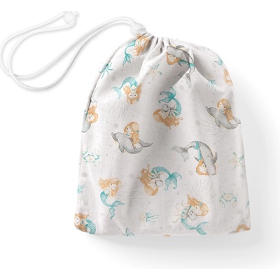 Bavlněný pytlík/sáček na přezůvky, s milým dětským motivem modrozelených mořských panen s delfíny a velrybami na bílém podkladu. Je ušitý z kvalitního hustě tkaného 100%...