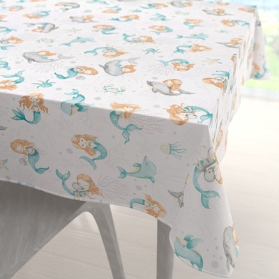 Dětský bavlněný obdélníkový dekorační ubrus na stůl s milým dětským motivem modrozelených mořských panen s delfíny a velrybami na bílém podkladu. Je ušitý z hustě tkaného 100%...