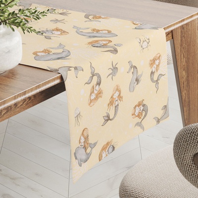 Dětský běhoun na jídelní stůl s milým dětským motivem šedo-hnědých mořských panen s delfíny na žlutobéžovém podkladu. Je ušitý z hustě tkaného 100% bavlněného plátna s...