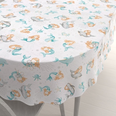 Dětský bavlněný oválný dekorační ubrus na stůl s milým dětským motivem modrozelených mořských panen s delfíny a velrybami na bílém podkladu. Je ušitý z hustě tkaného 100%...