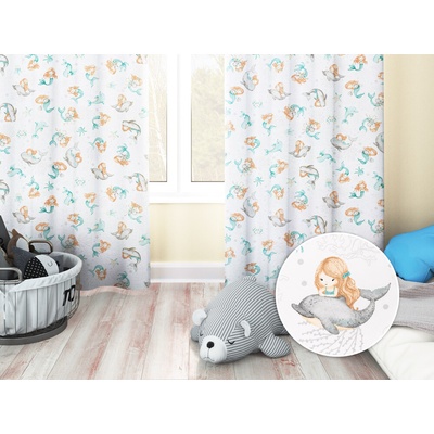 Dětský bavlněný závěs s milým dětským motivem modrozelených mořských panen s delfíny a velrybami na bílém podkladu. Je ušitý z hustě tkaného 100% bavlněného plátna s...