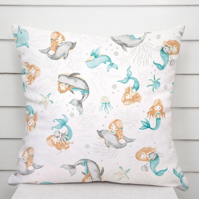 Bavlněný povlak na polštář s milým dětským motivem modrozelených mořských panen s delfíny a velrybami na bílém podkladu. Je ušitý z hustě tkaného 100% bavlněného plátna s...