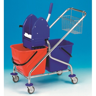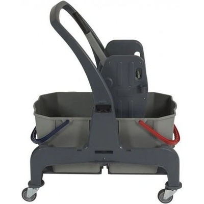 Odolné plastové rámování s kovovou rukojetí a kovovými kolečky. Dvě barevné kbelíky a robustní oboustranný lis na mop. Úložný koš se prodává samostatně. Objem kbelíku 2 x 17...