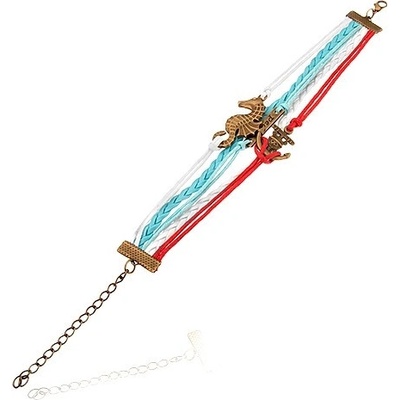 Náramek z motouzků - červený, bílý a světle modrý odstín, přívěsky bronzové barvy - mořský koník, kotva, známka - "peace".