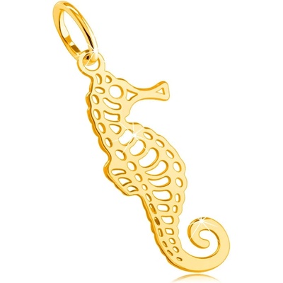 Zlatý přívěsek ze 14K zlata tvoří mořský koník se zakrouceným ocáskem, který je ozdoben výřezy různých tvarů.