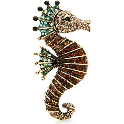 Krásná brož ve tvaru mořského koníka ozdobená krystaly. Krásně doplní a oživí vaše šaty nebo sako.
