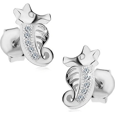 Náušnice ze stříbra 925, blýskavý mořský koník s úzkými výřezy na bříšku a s linií čirých zirkonků na hřbetě, puzetky.