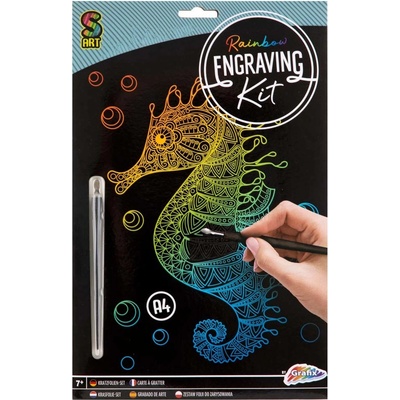Sada obsahuje obrázek mořského koníka natištěný na černém kartonu, škrabací pero a vzorek na vyzkoušení. Po seškrábání kontury předtištěného obrázku se objeví krásný duhový...