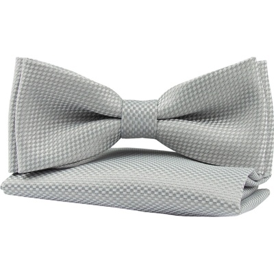Pánský motýlek Quentino – světle šedý s jemnou strukturou, včetně kapesníčku Elegantní předvázaný motýlek v světle šedém odstínu s jemnou strukturou působí decentně a moderně....