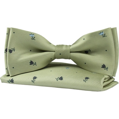 Pánský motýlek Quentino – šalvějově zelený s jemným květinovým vzorem, včetně kapesníčku Elegantní předvázaný motýlek v módním šalvějově zeleném odstínu s jemným květinovým...