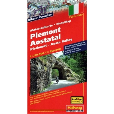 Motoatlas Alpy a Motomapu Švýcarska. Švýcarský výrobek je navržen speciálně pro motorkáře. Obsahuje jednak celkovou mapu zajímavé oblasti Piemont a údolí Valle d"Aosta...