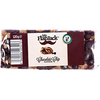 MR. FLAPJACK 120 g ČOKOLÁDOVÝ CHIP. Složení: oves (53 %), rostlinný margarín (palmový rostlinný olej, řepkový olej, voda, jedlá sůl), cukr, sirup z invertního cukru, třtinová melasa, chipsy s aroma čokolády (5 %) (odtučněný kakaový prášek, pšeničná mouka, sušená...
