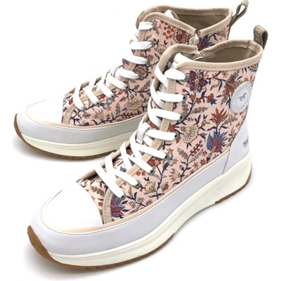 Dámské kotníkové tenisky s květinovým vzorem a stříbrnými detaily, vyrobené v kombinaci kvalitní syntetiky a textilu. Vnitřek obuvi tvoří textilní podšívka a komfortní stélka. Snadné nazouvání zajišťuje klasické šněrování a zip na vnitřní straně obuvi. - výška podešve...