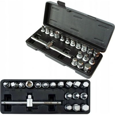 Sada nástrčných klíčů určených k demontáži a zpětné montáži výpustních šroubů olejových van. Sada je složená ze 17 různých nástrčných klíčů a pákou se zakončením 3/8“....