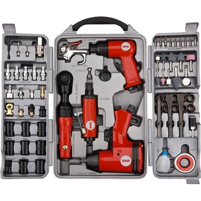 Sada pneumatického nářadí - 71 ks. Rázový utahovák 310 Nm. Min 300 l/min. Vzduchová bruska 22000 ot./min., 330 l/min. Vzduchové kladivo 3500 úderů/min., 320 l/min. Ofukovací...