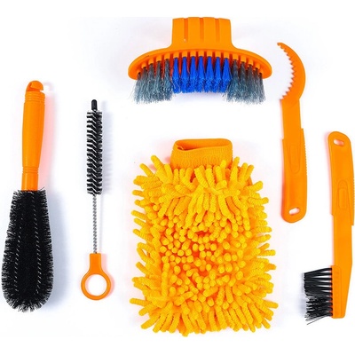 Souprava kartáčů pro snadné a efektivní čištění celého kola. Obsahuje celkem 6ks (kartáč na penumatiku, štěrbinový kartáč, rukavici s třásněmi, škrabku na převody, rovný kartáč...
